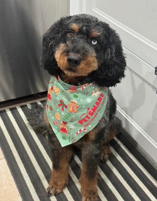 Oberon is the definition of quiet and easy-going. At first, he can be shy and then after a warm welcome he is your best pal. He is easy to live with, great with his family and friends with that signature doodle charm that wins everyone over.